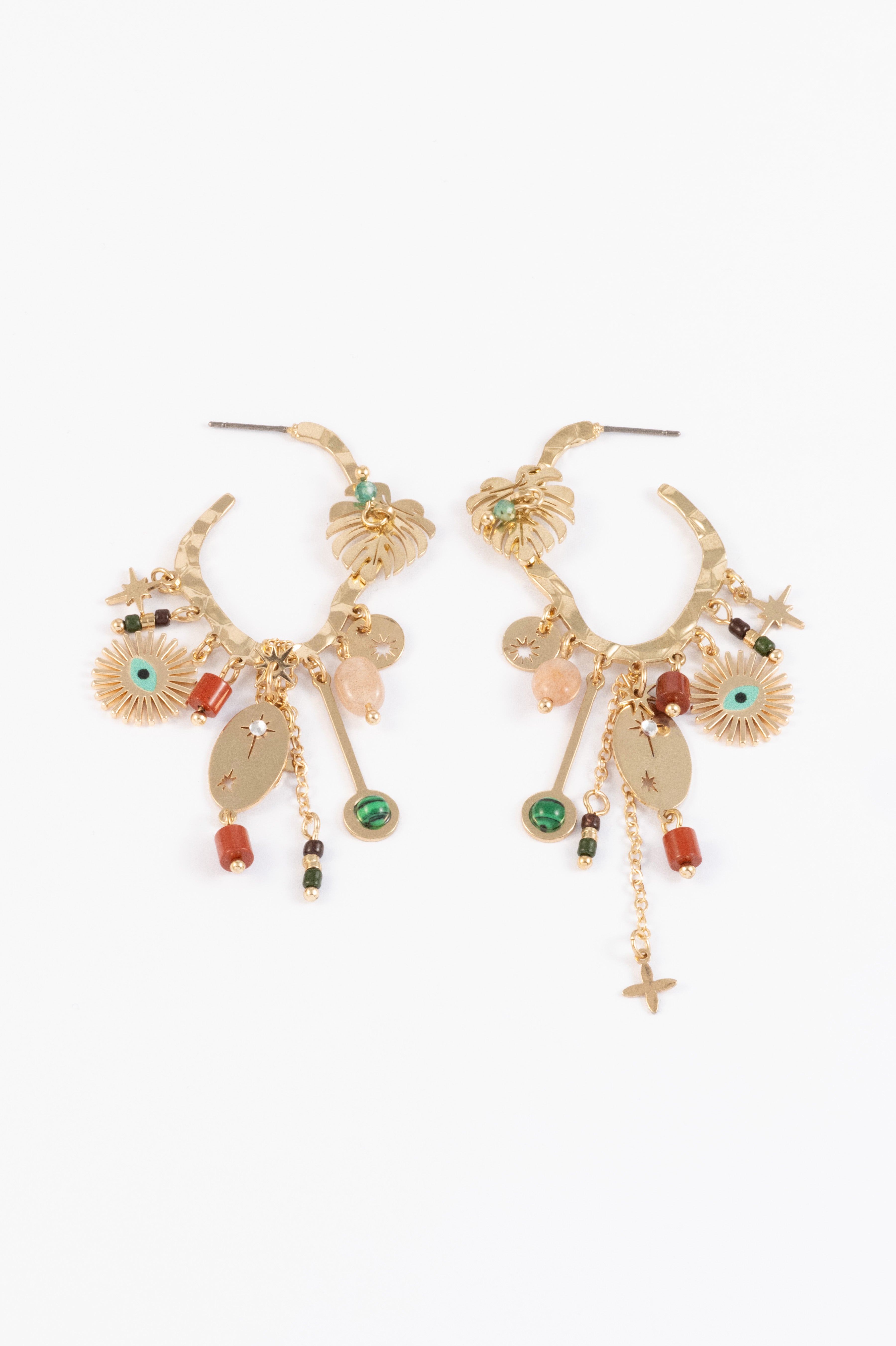 GOLD WITH ROSE QUATRZ STONE CHARM HINGED HOOP EARR