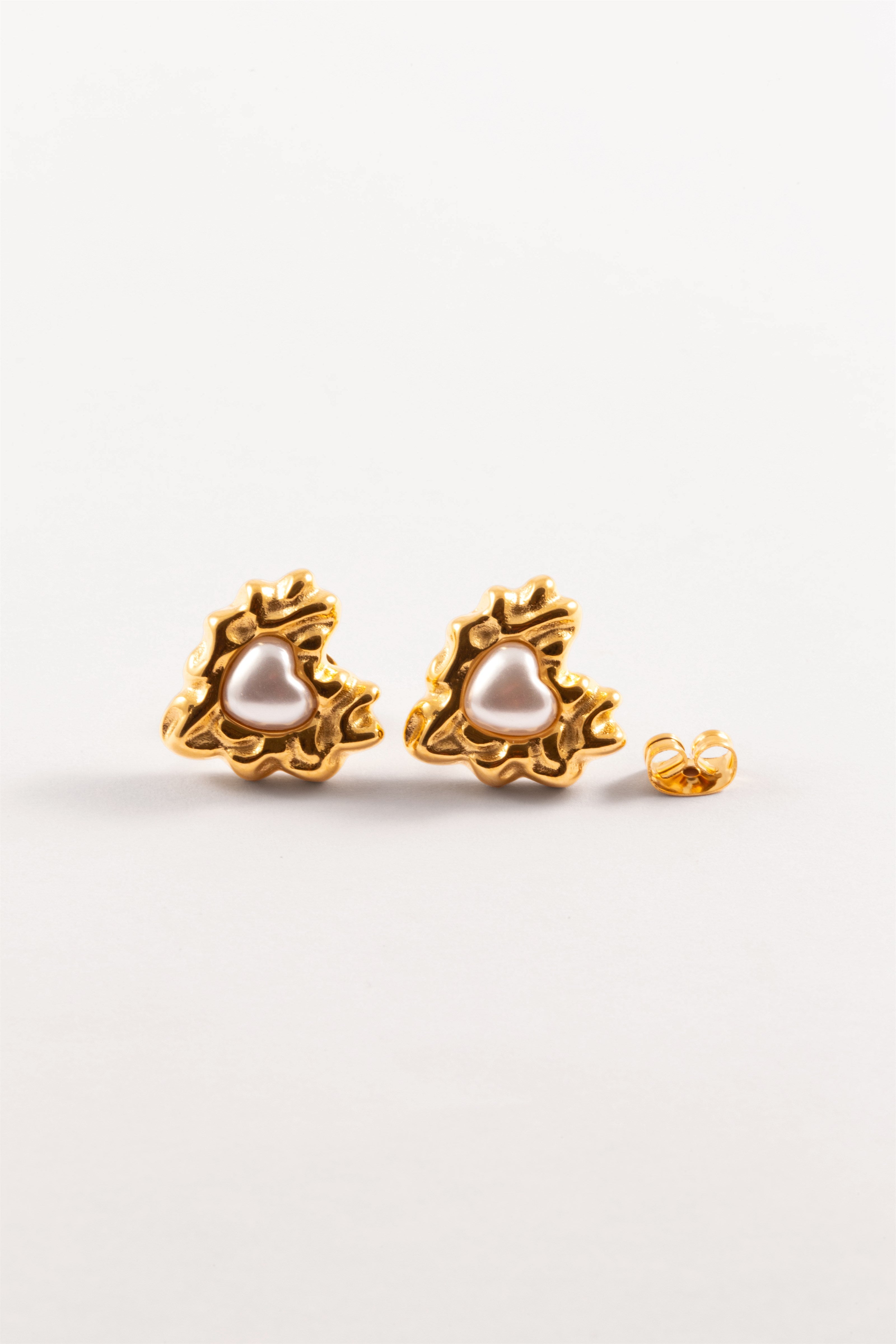 GOLD RIPPLE PEARL HEART STUD EARRING