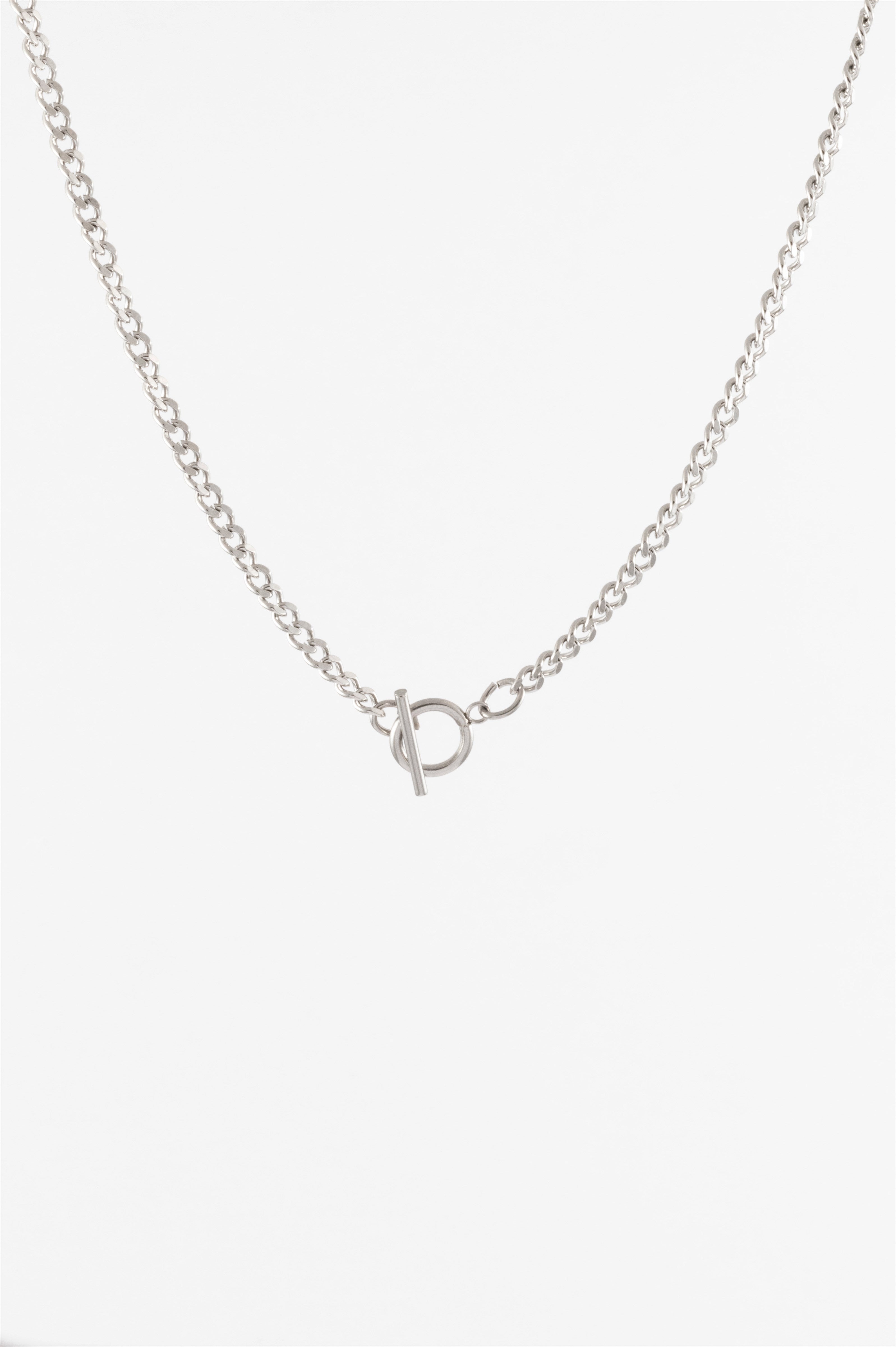 RHODIUM CURB CHAIN WITH CIRCLE AND BAR NECKLACE